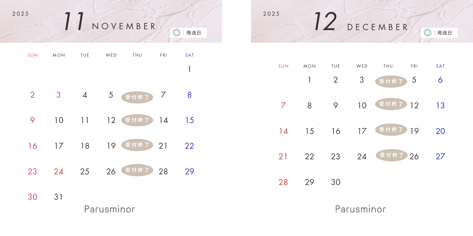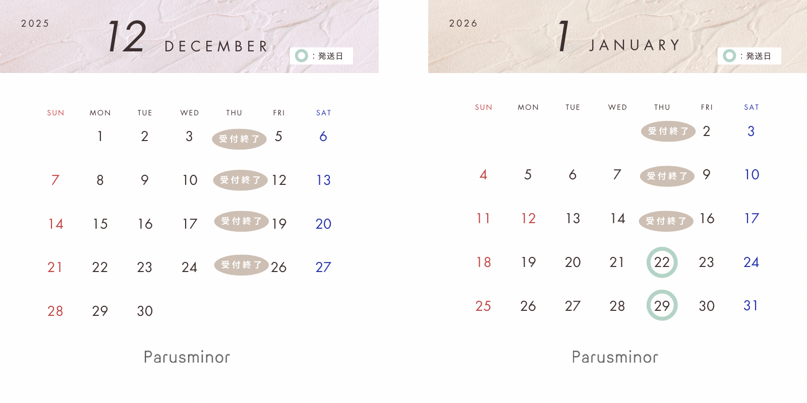 11月・12月・1月のオーダー受付状況について 2025 12/20 お知らせ 2025年11月20日2025年12月20日 【11月】受付終了しました 【12月】受付終了しました 【1月】 1月22日、29日発送分 1月1日、8日、15日発送分 お知らせ URLをコピーしました! 10月・11月のオーダー受付状況について [ギフトクッキー]オーダーに関するお知らせ