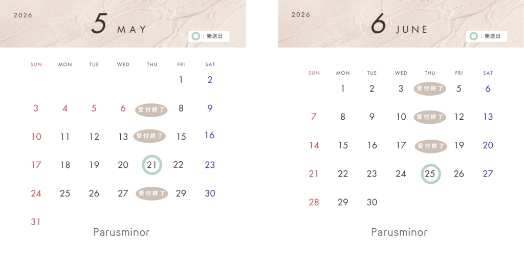 【NEW】5月・6月のオーダー受付状況について 2026 4/08 お知らせ 2026年4月8日 【5月】 5月21日発送分 5月7日、14日、28日 【6月】 6月25日発送分 6月4日、11日、18日 お知らせ URLをコピーしました! 【NEW】4月のオーダー受付状況について